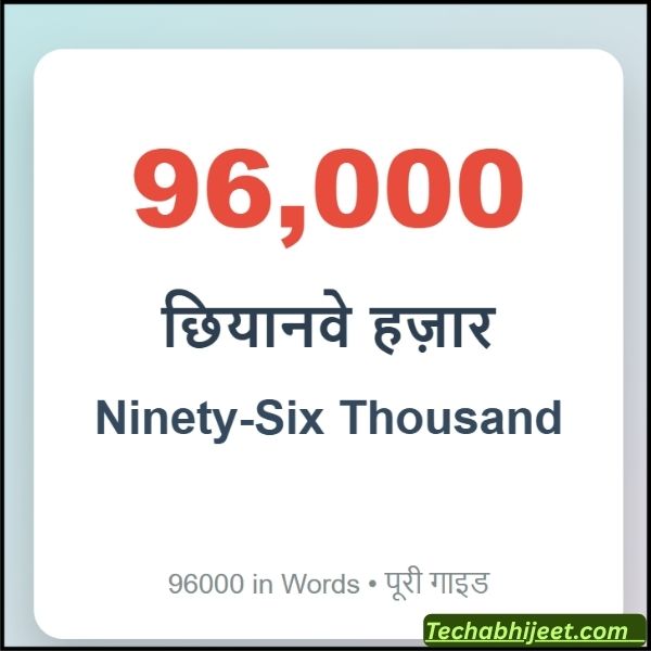 यहाँ आप सीखेंगे कि 96000 in hindi को हिंदी शब्दों में कैसे लिखते हैं, अंग्रेज़ी में कैसे लिखते हैं, और हिंदी अंकों में यह संख्या कैसे दिखती है।