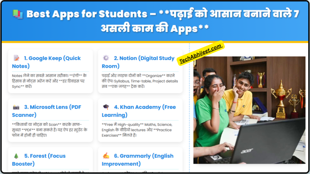 Best apps for students: Hello Friends आजकल पढ़ाई सिर्फ किताबों तक सीमित नहीं रही। चाहे स्कूल का स्टूडेंट हो या कॉलेज का हर किसी के पास फोन है, लेकिन बात ये है कि फोन को पढ़ाई के काम में कैसे लगाया जाए? इसलिए आज मैं तुम्हें अपनी खुद की experience वाली Best apps for students बताने वाला हूँ, जो सच में पढ़ाई आसान कर देती हैं। ये आर्टिकल कोई बोरिंग लिस्ट नहीं है बल्कि असली स्टूडेंट लाइफ में काम आने वाली apps हैं, जिन्हें इस्तेमाल करके पढ़ाई में improvement दिखाई देता है।