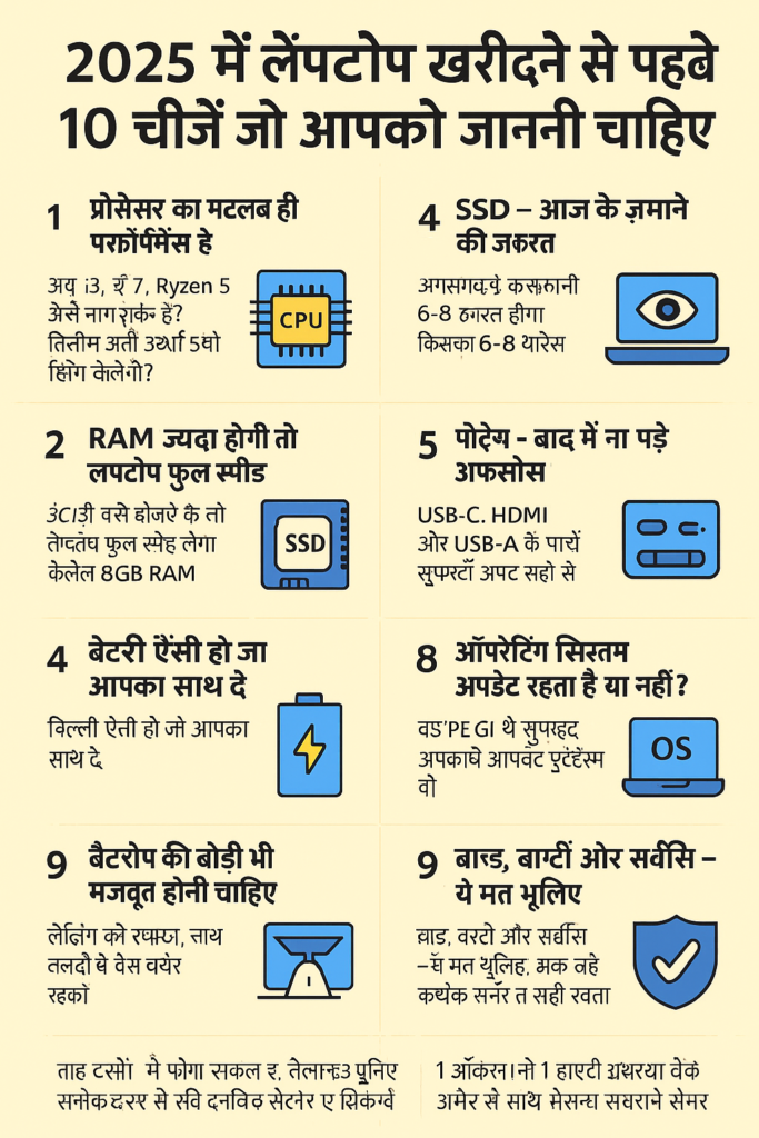 hello Fiends, आजकल का दौर ऐसा है जहाँ मोबाइल, घड़ी, लाइट सब स्मार्ट हो चुके हैं, तो लैपटॉप लेना भी अब बस “चलो कोई भी ले लो” वाली बात नहीं रही। 2025 में इतने सारे ऑप्शन हैं कि कन्फ्यूजन होना लाजमी है। इसलिए अगर आप नया लैपटॉप लेने की सोच रहे हैं, तो ये 10 बातें ध्यान में रखना बहुत ज़रूरी है – वरना पैसा लगाकर भी मजा नहीं आएगा।