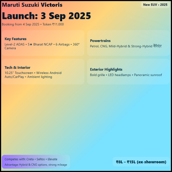 यह तारीख इसलिए भी खास मानी जा रही है क्योंकि सितंबर से भारत में त्यौहारों का सीजन शुरू हो जाता है। Maruti Suzuki ने इसी मौके को ध्यान में रखते हुए Victoris को लॉन्च किया ताकि लोग त्योहारों पर नई SUV खरीदने का सपना पूरा कर सकें।