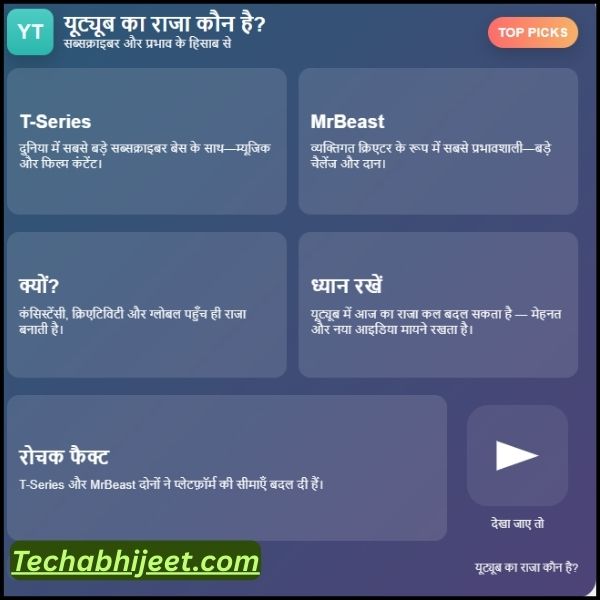तो भाई, यूट्यूब का राजा कौन है? इसका जवाब सीधा है – सब्सक्राइबर और व्यूज़ के हिसाब से T-Series, और व्यक्तिगत क्रिएटर्स में MrBeast। लेकिन याद रखो, यूट्यूब की दुनिया में आज का राजा कल बदल भी सकता है। यहाँ मेहनत, क्रिएटिविटी और लगन ही असली हथियार हैं।